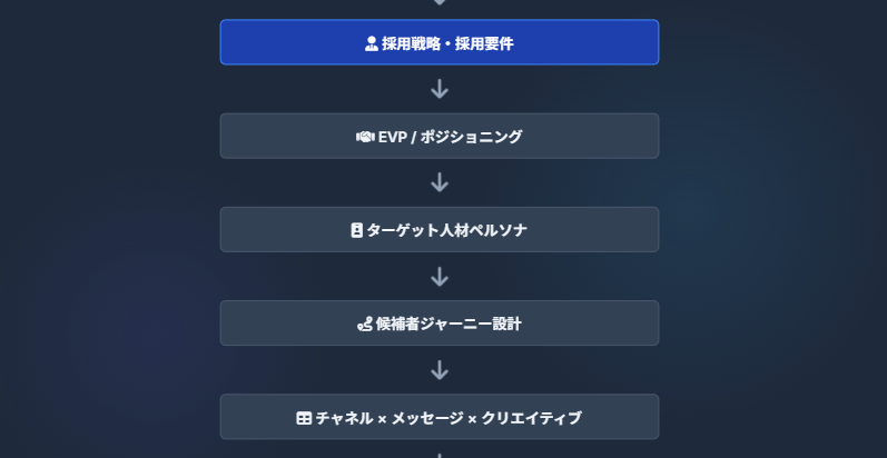 採用戦略設計から母集団形成、選考フロー改善、SNS運用、エージェントマネジメントまで一気通貫でご支援。